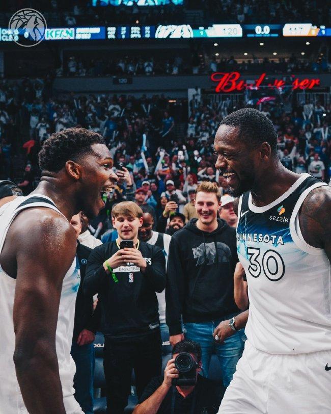 丛林狼(8-6):兰德尔35分4篮板7助攻、爱德华兹24分4篮板6助攻、迪文琴佐15分3助攻、里德13分4篮板、戈贝尔11分10篮板、麦克丹尼尔斯11分